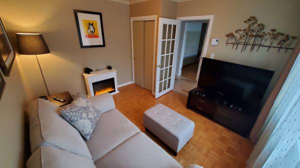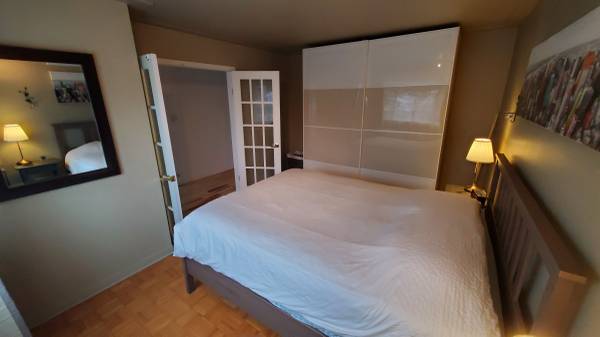 ** Large renovated 2125 sq. ft. apartment on the ground floor of a duplex – 3 bedrooms, 2 bathrooms – Well soundproofed and insulated – High-end appliances included and partially furnished – Lots of storage space – 11 min from Longueuil metro station by bus – Three parking spaces and large private outdoor shed – Wood stove – Very large private yard with patio and many trees **