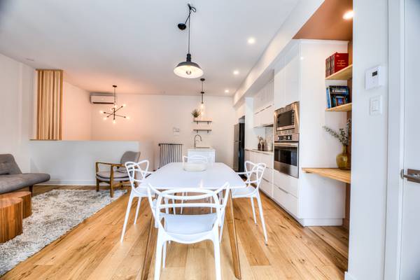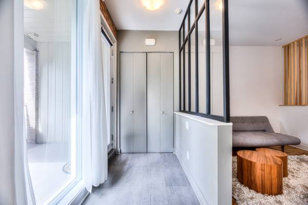 Duplex-style, modern, and well laid out - Furnished and fully equipped (stove, refrigerator, dishwasher, microwave, washer/dryer) - Private entrance - Two floors, 2 closed bedrooms, 1 open space (for office or family room), 1 full bathroom, 1 powder room - Private covered outdoor terrace at the entrance - Indoor bike storage - Air conditioning (wall-mounted heat pump) and air exchanger - Superior soundproofing