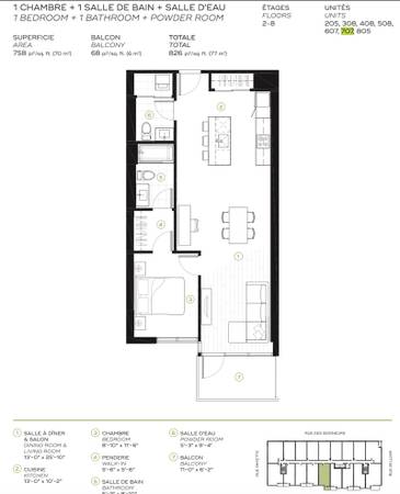 - 758 sq. ft. interior + 68 sq. ft. balcony (total 826 sq. ft.)