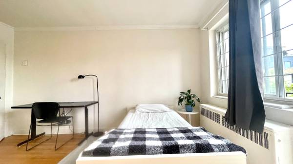 The rent is 1350$/m, including heating, electricity, hot water, and internet. The apartments are fully furnished, with the fridge, the stove, the microwave, one single bed, one desk, and two chairs. Laundry facilities are in the building.