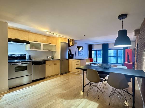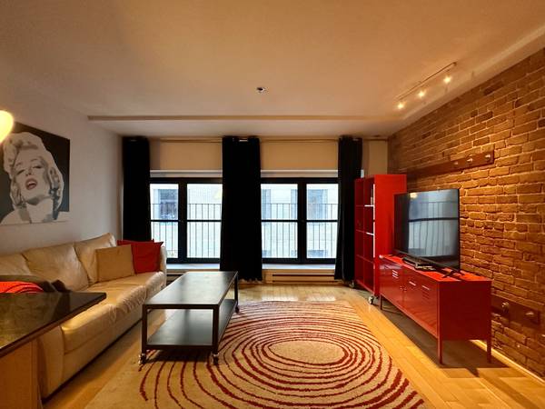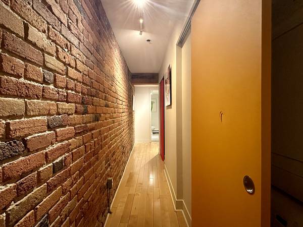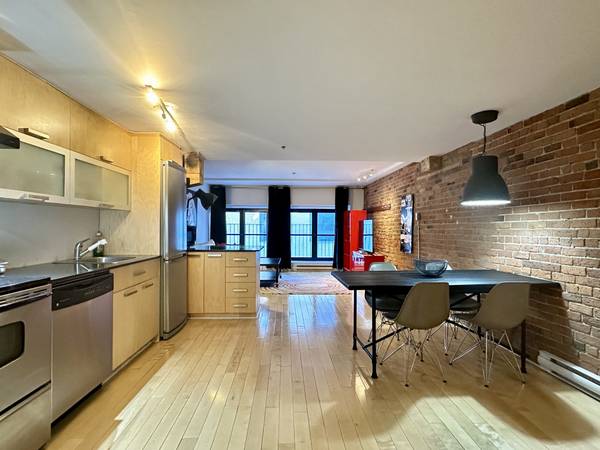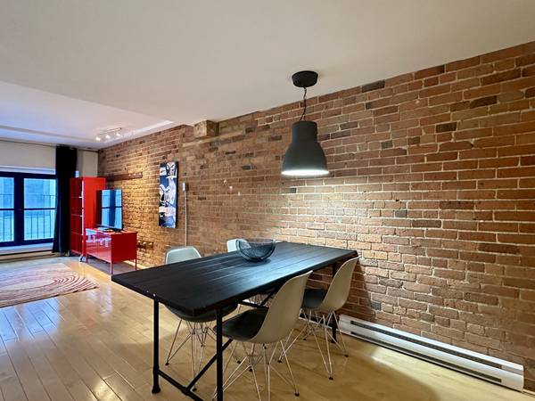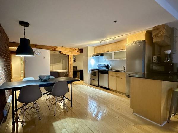 Typical features of Old - Montreal: hardwood floors, brick walls, exposed beams
