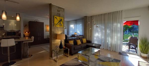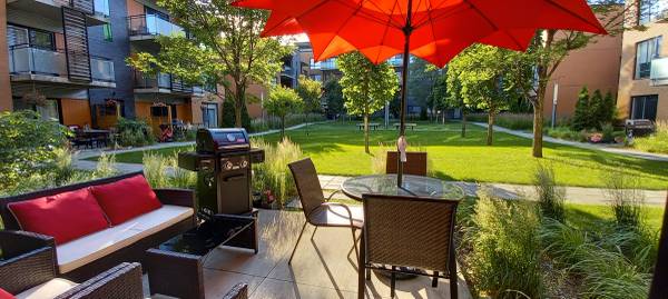 Located on the ground floor, the apartment is a large 4 ½ (loft style) of 900 square feet (closed bedroom + open-air room with office) with a private ground-floor terrace giving direct access to a huge, green, and secure inner courtyard.