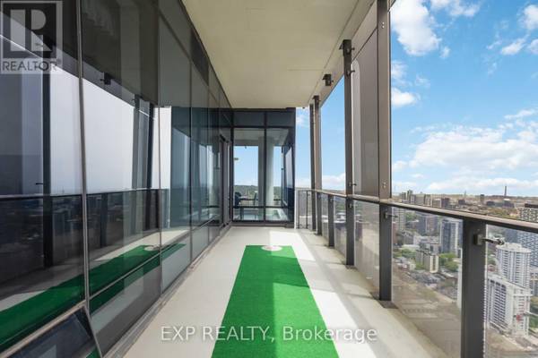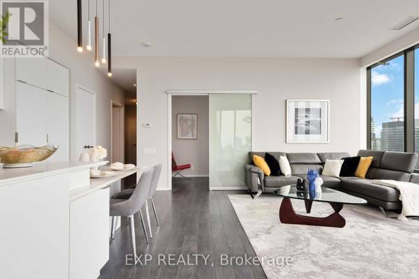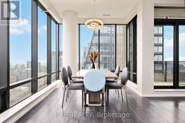 A true masterpiece in the sky where timeless design meets breathtaking views. Perched on the 46th floor - Penthouse, this rare southeast corner residence offers approximately 1,500 square feet of elegantly appointed living space, wrapped in floor-to-ceiling windows that capture sweeping, unobstructed views of the city skyline and Lake Ontario. From sunrise to the most spectacular sunsets, every room is flooded with natural light and panoramic beauty. This exceptional suite features three spacious bedrooms, including a den thoughtfully converted to a third bedroom, soaring 10-foot ceilings, wide-plank hardwood floors throughout, and a grand, open-concept entertaining space that flows seamlessly onto a massive private terrace. The sleek, modern kitchen is equipped with fully integrated Miele appliances, perfect for both everyday living and sophisticated gatherings.