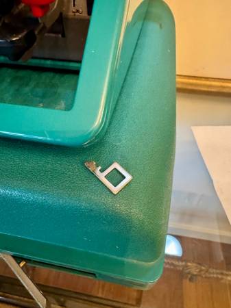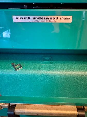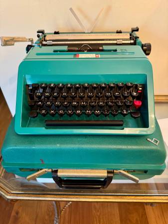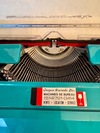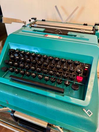 IMPECCABLE Vintage turquoise Olivetti Underwood Studio 45 typewriter and carrying case from 1968. Dactylo, machine à écrire.