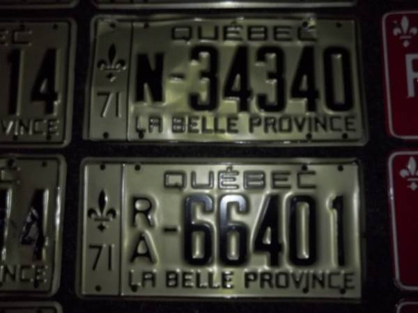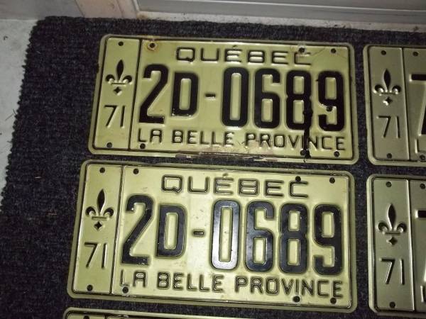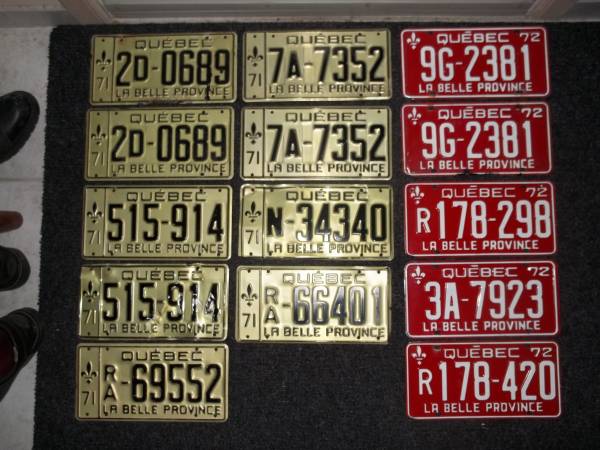 06 PLAQUES IMMATRICULATION ANCIENNES 1971-1972 2X 1971 NO. 2d-0689 $30.00 2X 1971 NO. 515-914 $25.00 1X 1971 NO. ra-69552 $25.00 VENDU 2X 1971 NO. 7a-7352 $40.00 VENDU 1X 1971 NO. n-34340 $15.00 1X...