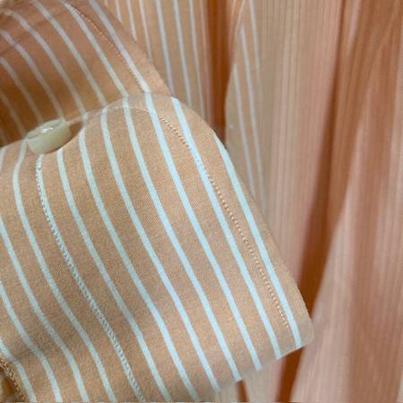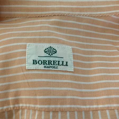 Italian-made shirt by Borrelli in excellent condition. Button-down collar. All intact, and has one extra button sewn on. Orange (salmon) and white stripes. Small/petit. Cash only. Local pickup only.