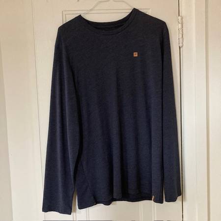 Intended as a t-shirt, this could almost be layered as a lightweight sweater. Men's XL, blue heather. (A medium-dark blue; my old phone doesn't always render colors properly.) Blend of polyester, Tencel, and organic cotton. New with tags. Retails for $50. Cash only. Local pickup only.