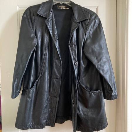 Ladies three-quarter length vintage black leather coat, in excellent condition. Showing only modest wear. Not sure of the exact age of this coat. It could date to the 80s or 90s, but has a 1970s look (see the slash-style pockets). Good, medium-weight leather. The coat once had a removable liner, which is missing. The sleeves are generous, though, so wearer can easily layer a sweater, etc... The standard liner and sleeves are also in excellent condition. All buttons original and intact, except for one inside right sleeve (presumably the wider sleeves allowed the additional liner to include the sleeves). No stains, scuffs, or edgewear; this garment has a lot of life remaining. Cash only. Local pickup only.