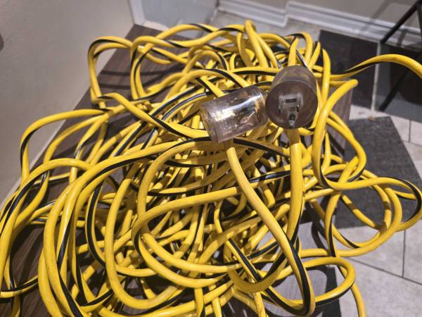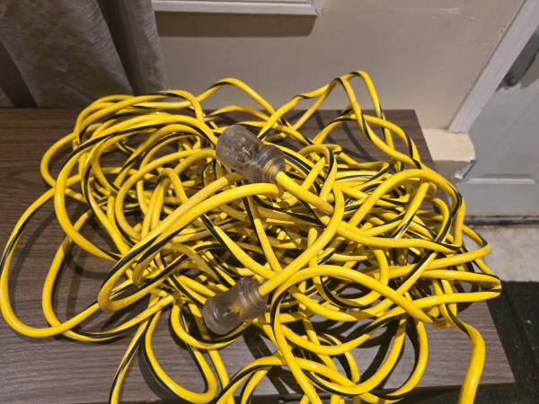 This is as good as new 10 ft all-weather extension cord, perfect for both outdoor and indoor usage. The bright yellow colour ensures high visibility, and it's designed to withstand various weather conditions. It is in good working condition and ready for your next project or seasonal lights setup.
