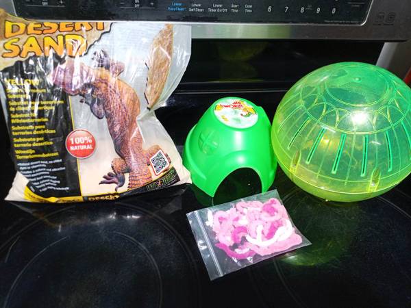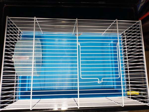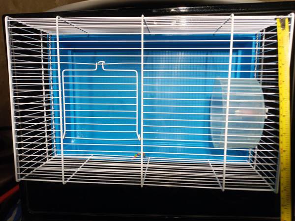 As depicted. You'll get everything shown on the pictures: the cage with the wheel, the hamster house, the sphere and supplies. The cage sizes are (L/W/H): ~18"/11"/9". Cash and carry only.