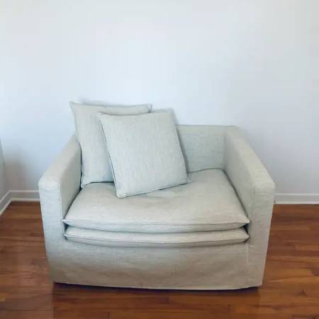 Mobilia new small sofa/ oversize armchair. Receipt provided for warranty. 46 width. 38 depth. 34 high. Pick-up only
