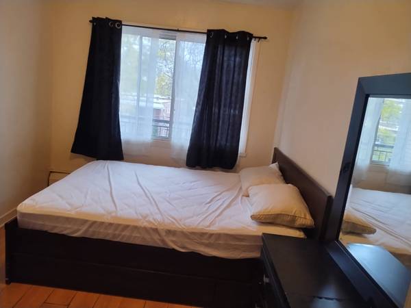 Large furnished room for rent in a 4 ½ apartment not far from Côte vertu metro station available now. The room can also be booked for December 1, 2025, or another date. Heating, electricity and internet are also included, a TV is in the living room. There is a laundry room in the building. Pets are not allowed. Smoking is not permitted inside the building. Buses 64 (very regular and in front of the building) and 170 are close by and less than 15 minutes to Côte Vertu metro station. Buses 164 and 180 are also nearby and lead to Henri Bourassa and Sauvé metros respectively.