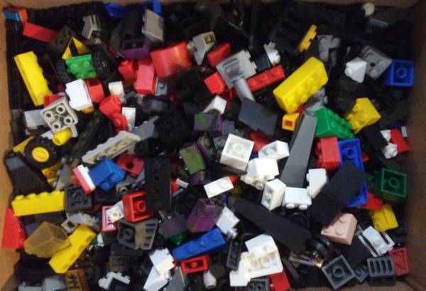 3 lb de blocs de construction variés avec figurine monstre-dragon(non comptabilisée dans le 2,5 lb) Ressembles à du Lego, compatibles avec Lego, mais pas des Legos. Le tout dans un bac de rangement en plastique bleu -- 30$